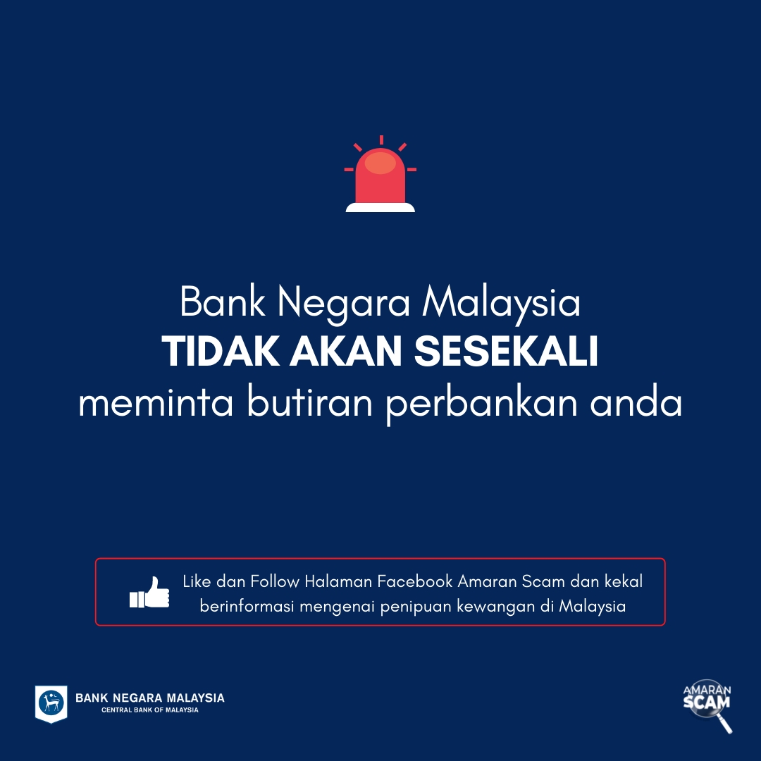 “Amaran Scam”说,国家银行不会向民众索取银行的资料,银行的验证码与密码等属于机密信息,不应随意透露给他人知道。