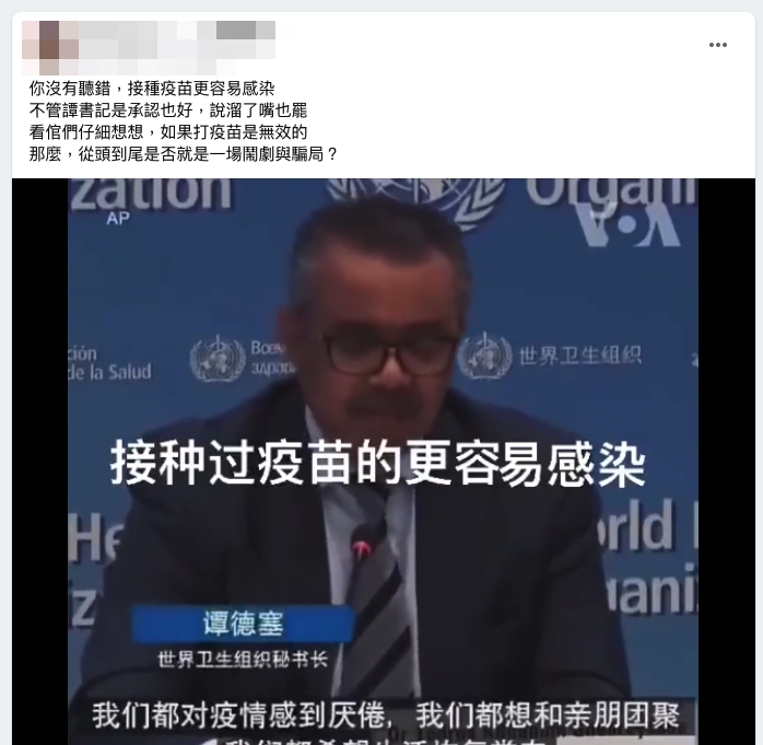 最近,社交媒体上流传一段视频指出,谭德塞说接种冠病疫苗者会更容易感染Omicron病毒。