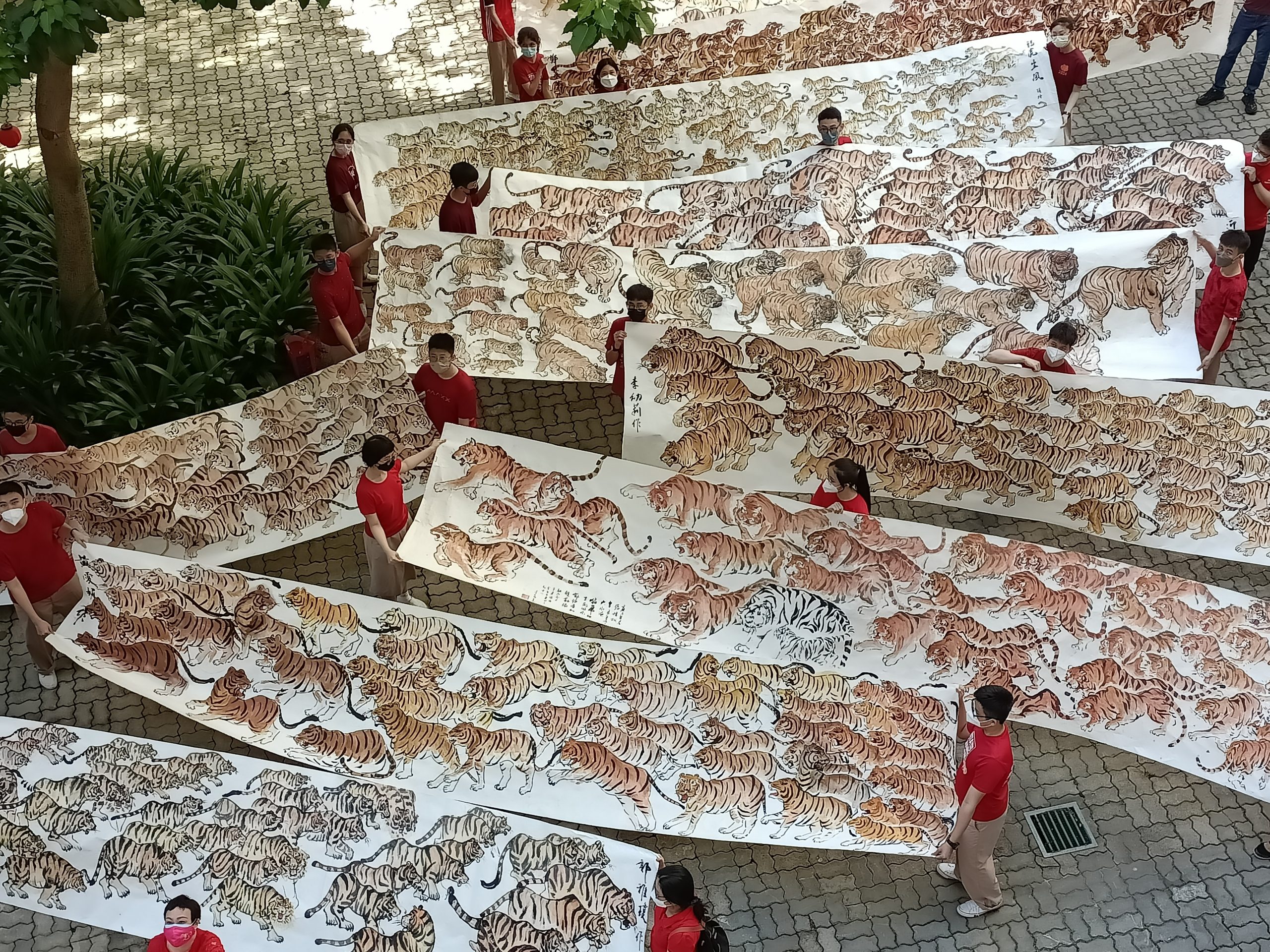 这是由该文化中心联合50名书画艺友,画出2022只老虎,以2022只虎画及2022个虎字进行创作,并以虎力、虎气、虎胆、虎猛的威慑力与震撼力,打造强而有力的气场,寓意以恶镇妖,传播发扬健康及有力量与美好信念,与疫情相对抗。