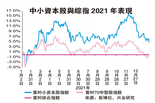 兴业研究表示,中资本股(富时70指数)在2021年的表现比大市更差,跌6.2%,相比大市仅跌3.7%,这是因为受手套股的ESG问题与繁荣税所干扰;区域的小资本股表现(日本、新加坡与印尼除外),以灵巧敏锐而跑赢大市。
