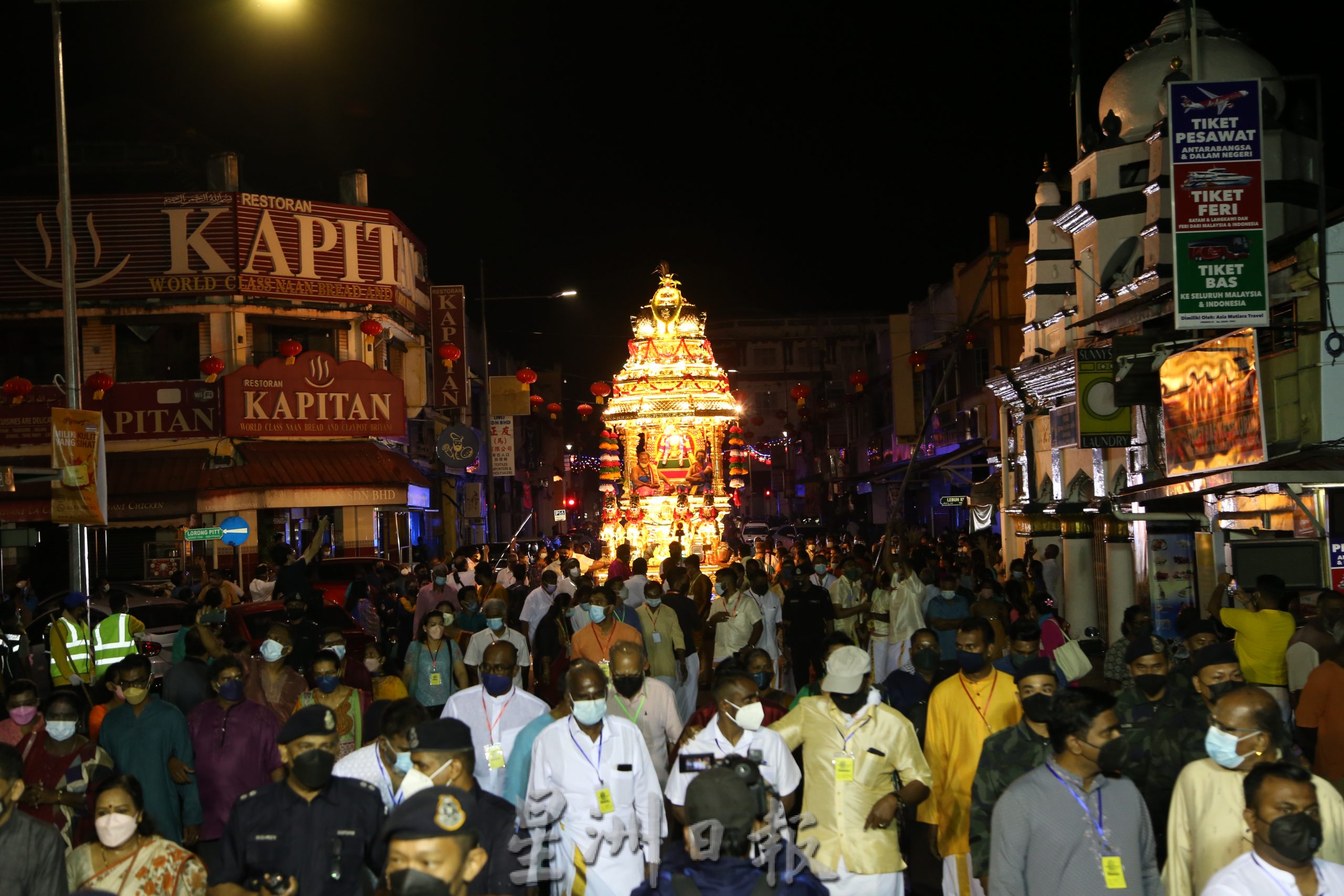 (槟城17日讯)今年大宝森节神辇游行活动仅有神庙理事可随行,近千名信徒则沿街参拜。