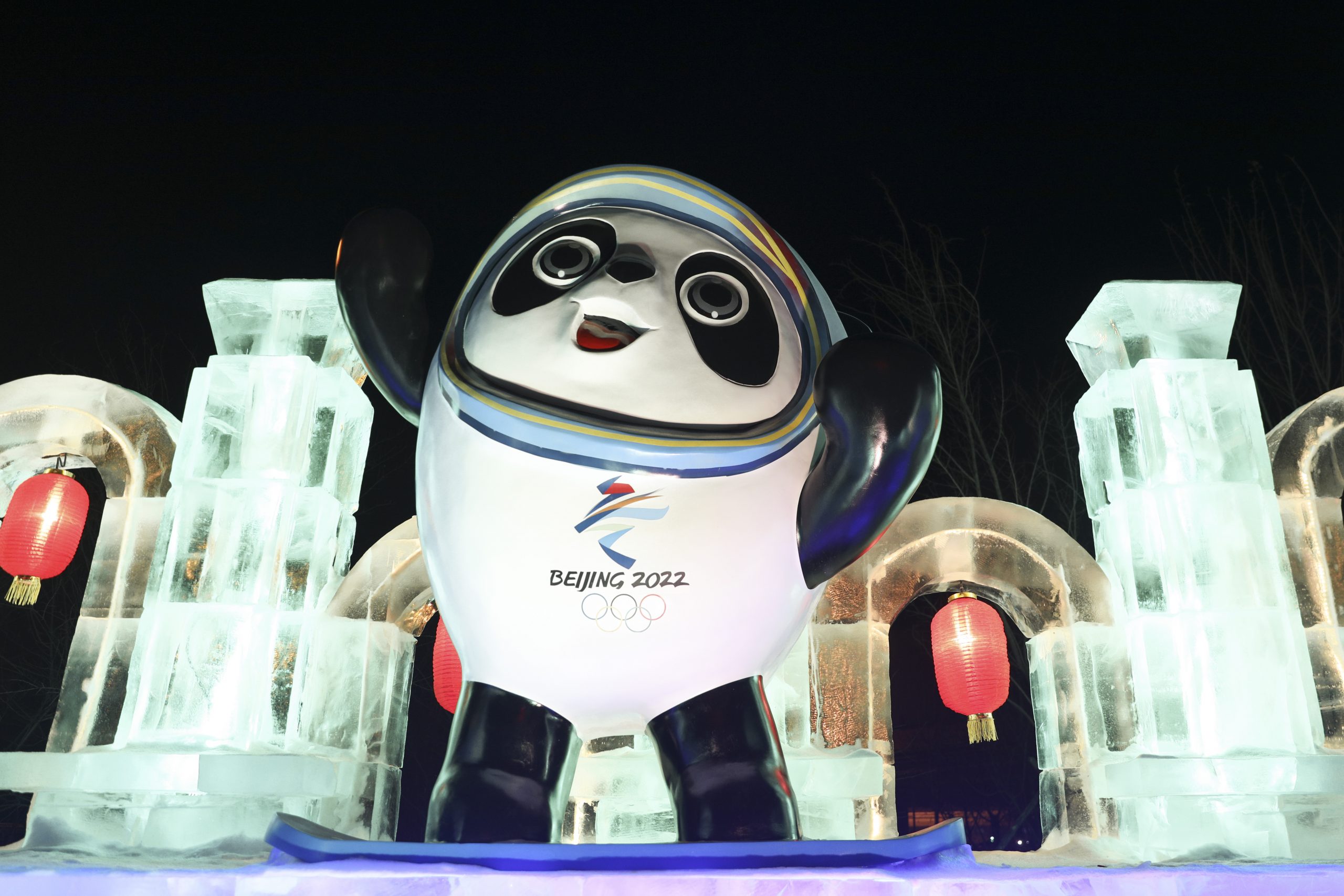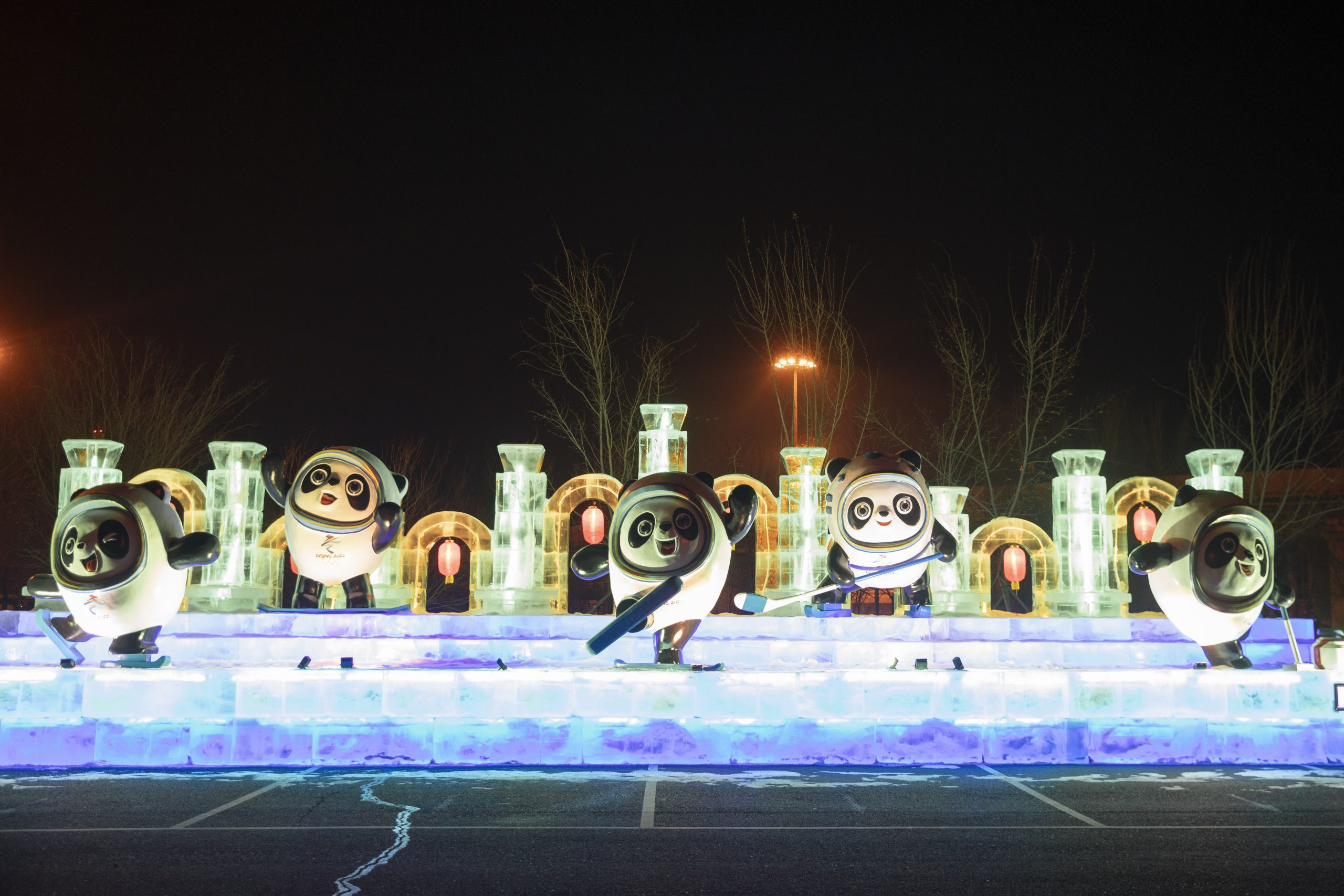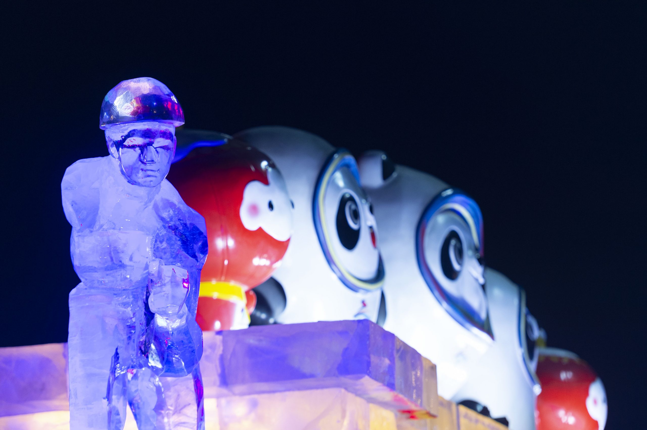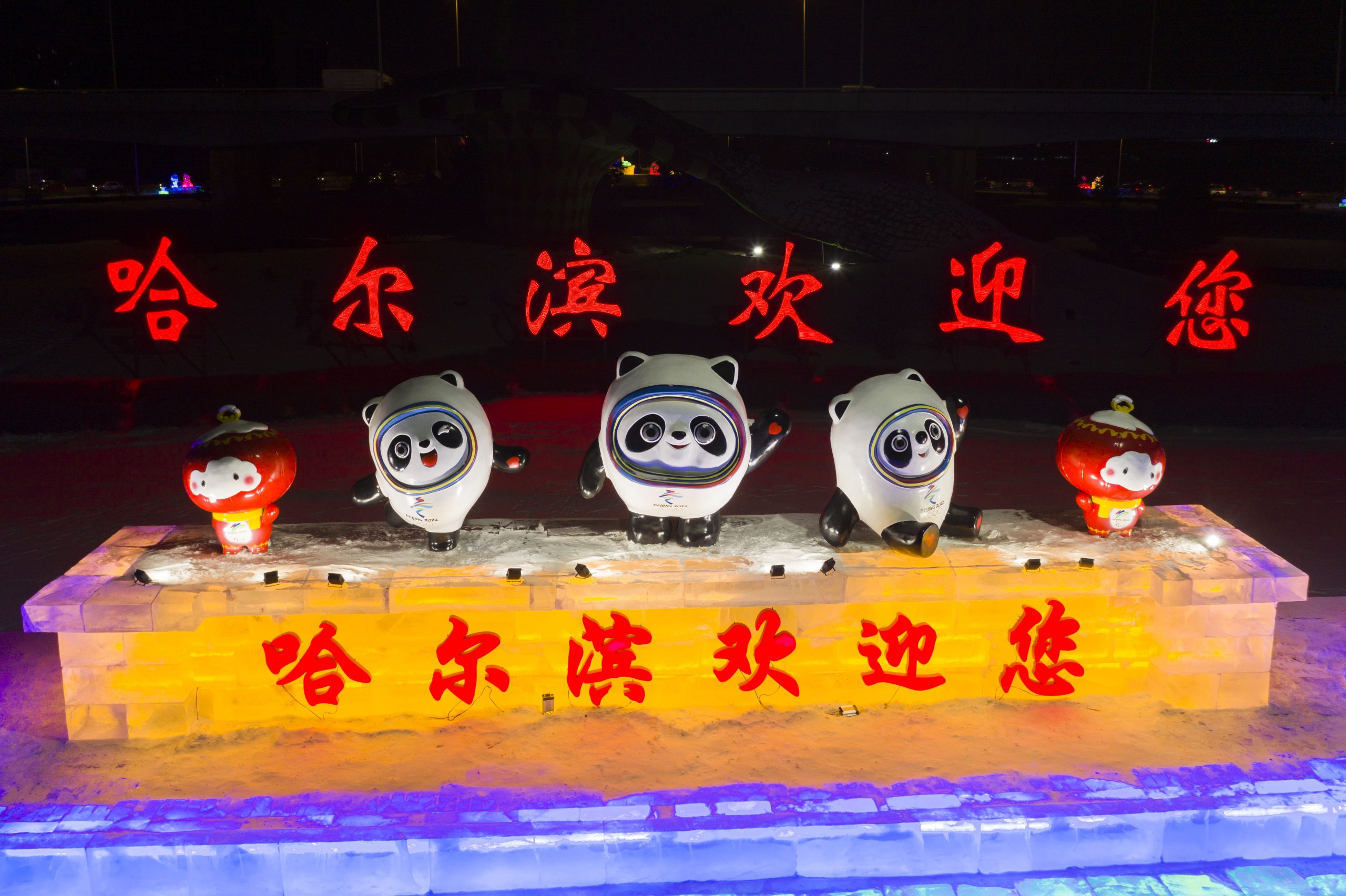哈尔滨2022年1月18日冰城“尽飘”冬奥味道。可爱的熊猫造型冰雕在哈尔滨太平国际机场欢迎您。 (新华社图)