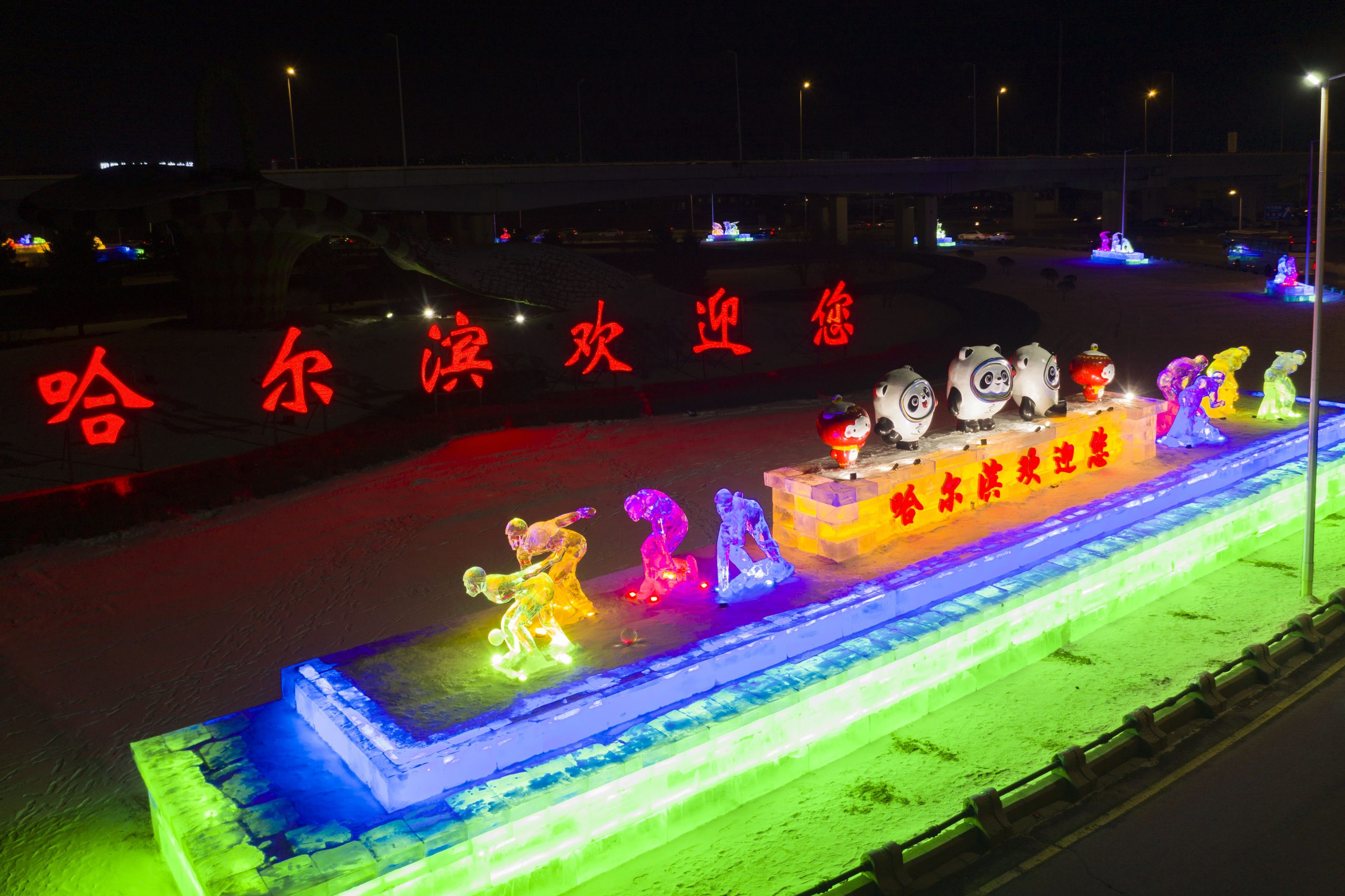 沿着路边行走可以看到可爱的熊猫热情的写着哈尔滨欢迎您。(新华社图)