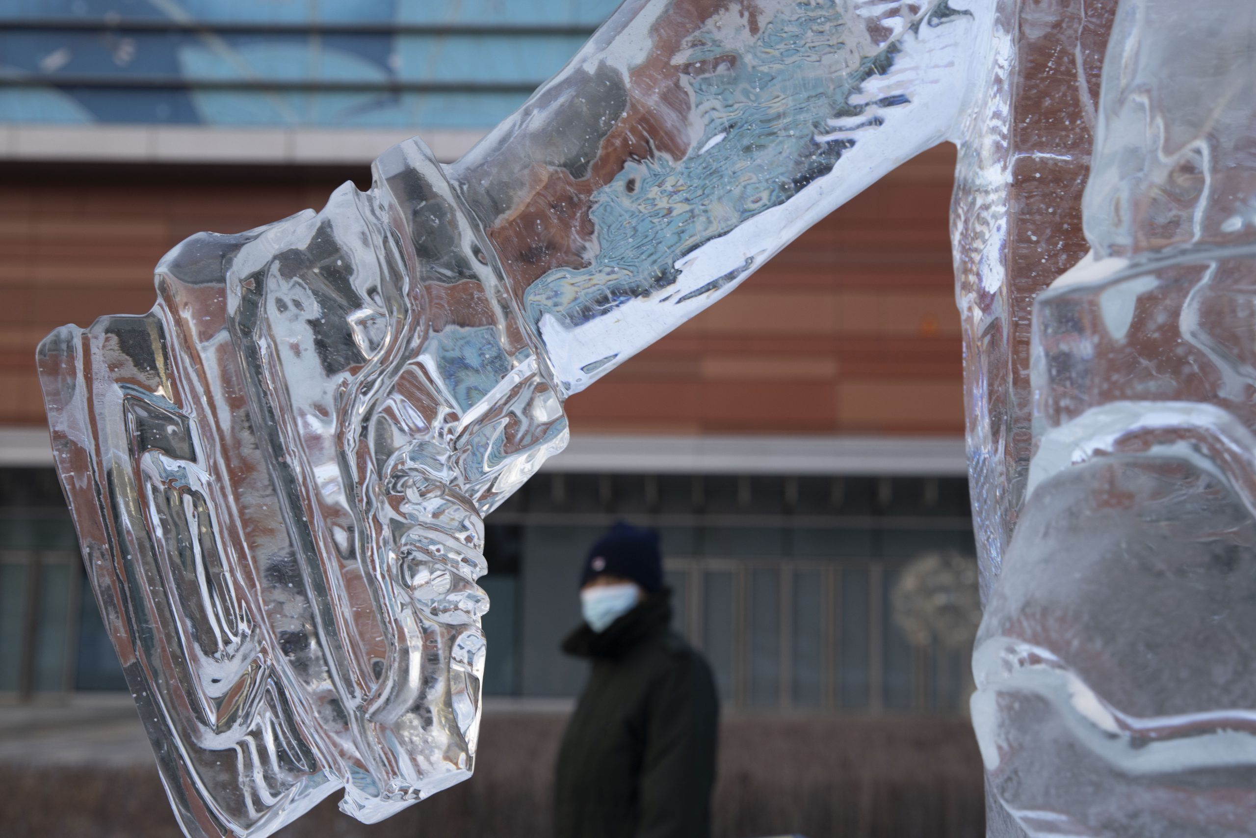 在哈尔滨市世茂大道与聚源街街口附近拍摄的一处冰雕。(新华社图)
