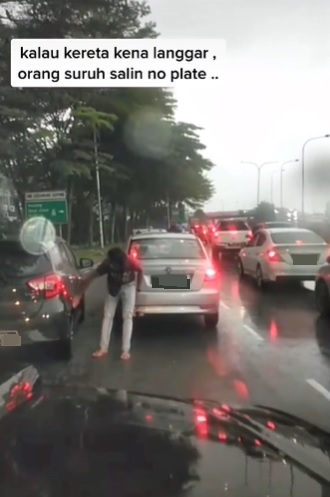 (八打灵再也20日讯)若发生车子被撞,司机第一时间就会记下或拍下肇祸司机的车牌号码和车型,以免对方肇事逃逸。然而,一名男子却在车子被撞后,当场强硬扯下肇祸司机的车牌,野蛮行径让人看了傻眼。