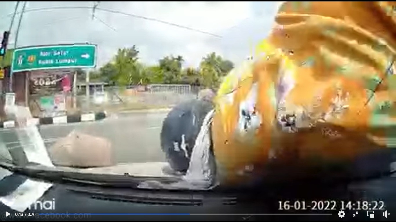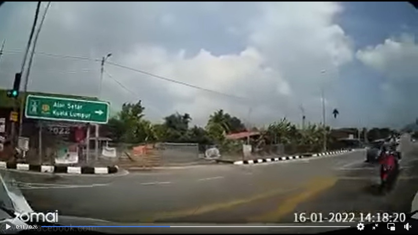 据了解,这起事件发生于星期日(16日)下午2时20分。从网络流传的行车记录视频可见,当时一辆迈薇轿车行驶到一个T字路口,看交通灯转绿后就缓缓转向右边,岂料一辆两人共乘的摩托车闯红灯,直接撞上轿车的车身右侧。