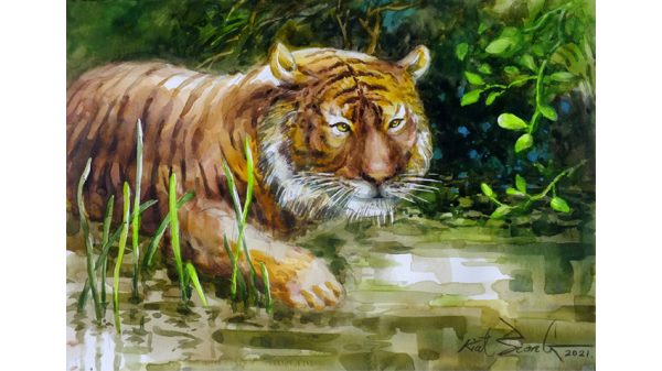 画虎和画其他四腿动物一样,最难的是眼晴。要画出高傲、狡猾、庸懒和霸道的虎之眼神和重重叠叠的斑纹,非细致用心不可,这样才能展现自然的神采和意境。在迎接喜庆佳节的当儿,让我们透过金虎, 一起领略即将腾跃的新气象。