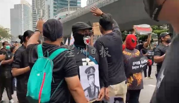 此外,队伍中有一名集会者装扮成阿占巴基的样子,然后其他人则在他身上缠绕铁链,象征着他们要求执法单位逮捕阿占巴基的诉求,引起不少集会者围观。