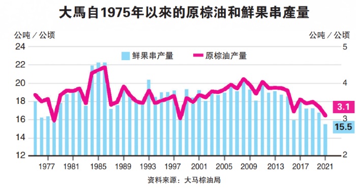 “在2021年,大马原棕油产量按年下跌7.1%,至每公顷3.1公吨;鲜果串产量更年减7.5%,至每公顷15.47公吨。以绝对值来看,原棕油产量年减5.3%,至1810万公吨。”