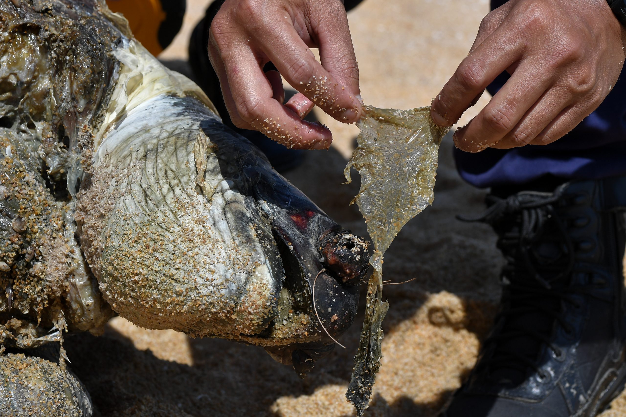 他说,这只海龟疑似误食塑料而死亡,因为检查它的尸体时,在它的嘴里发现塑料块状物体。