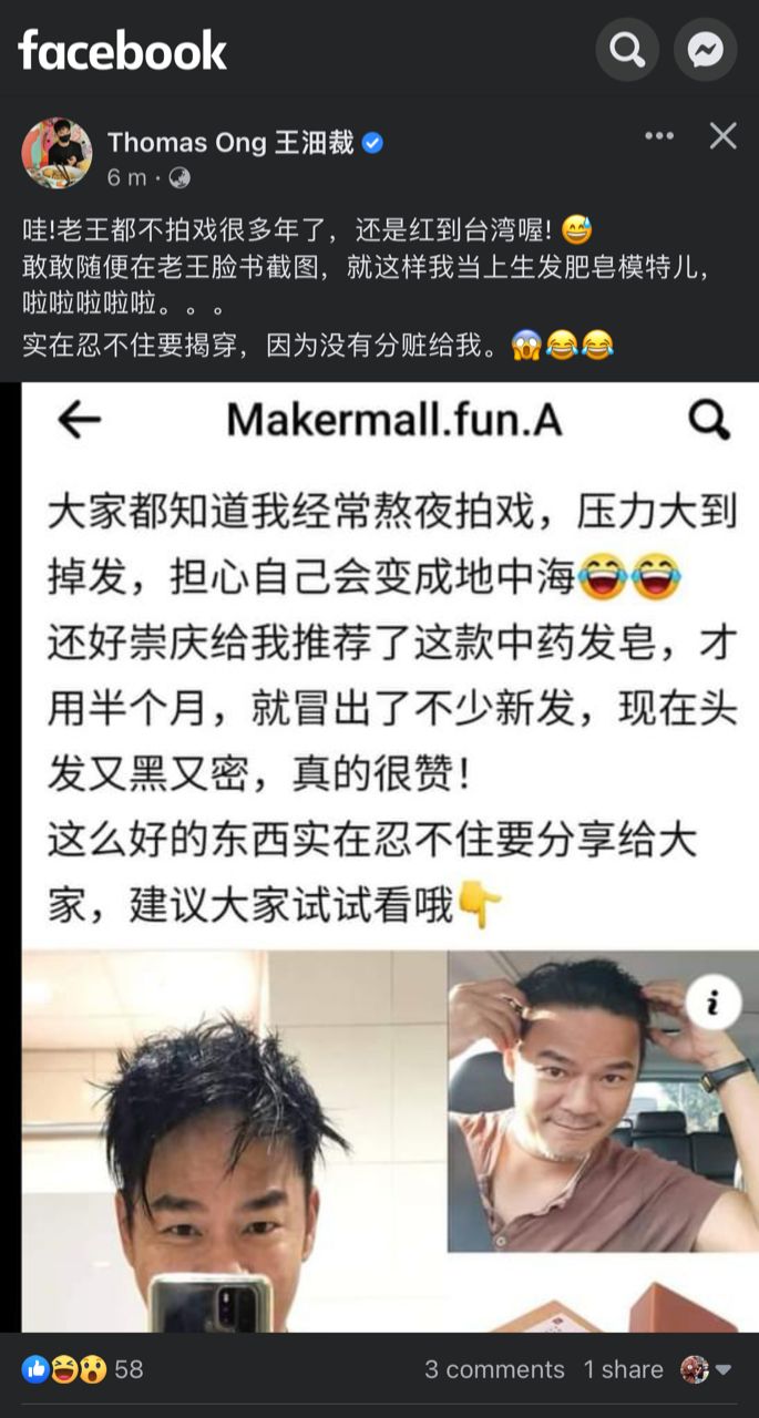 脸书上一个名为“Makermall.fun.A”的专页近日发布一则生发肥皂的广告,当中声称王沺裁是它们的产品用户,并附上了王沺裁头发湿淋淋的照片,以“证实”他使用了其产品来洗头。