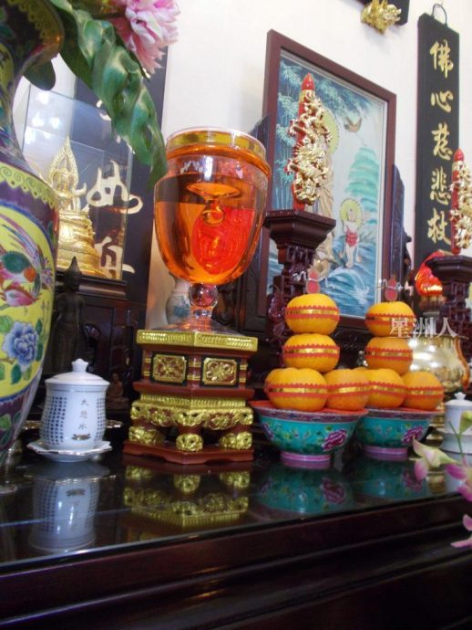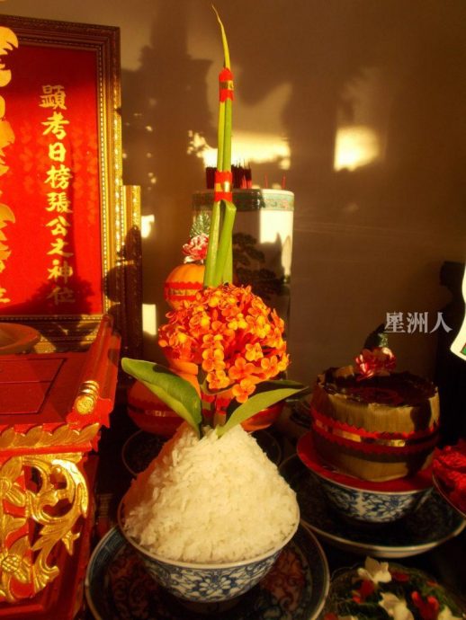 大厅神案则有两对大红烛,一对玻璃瓶油灯(北马峇峇话叫做石宝),油灯分两部分,下部是染红色的水,瓶子的盖子翻转成为上部,放上油点燃。一切准备就绪,他们就开始了接年。仪式从打开大门开始,表示迎接新年的到来。接着焚香膜拜天公、神明、祖先、灶君等,焚化金纸就完成了。这些供品摆放到年初四才收下,初四也是迎接灶君神明回家的日子。