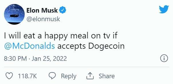 他发文指,“如果麦当劳接受狗狗币,我将在电视节目中吃开心乐园餐。”