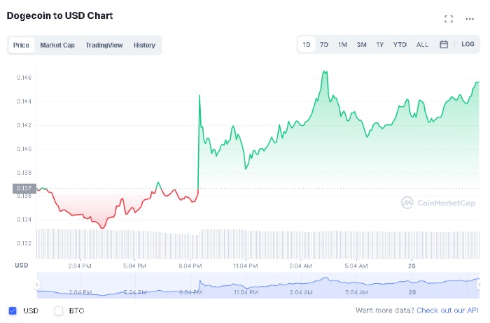 马斯克推文一出,狗狗币一度大涨逾7%,截稿前,暂报0.1456美元。