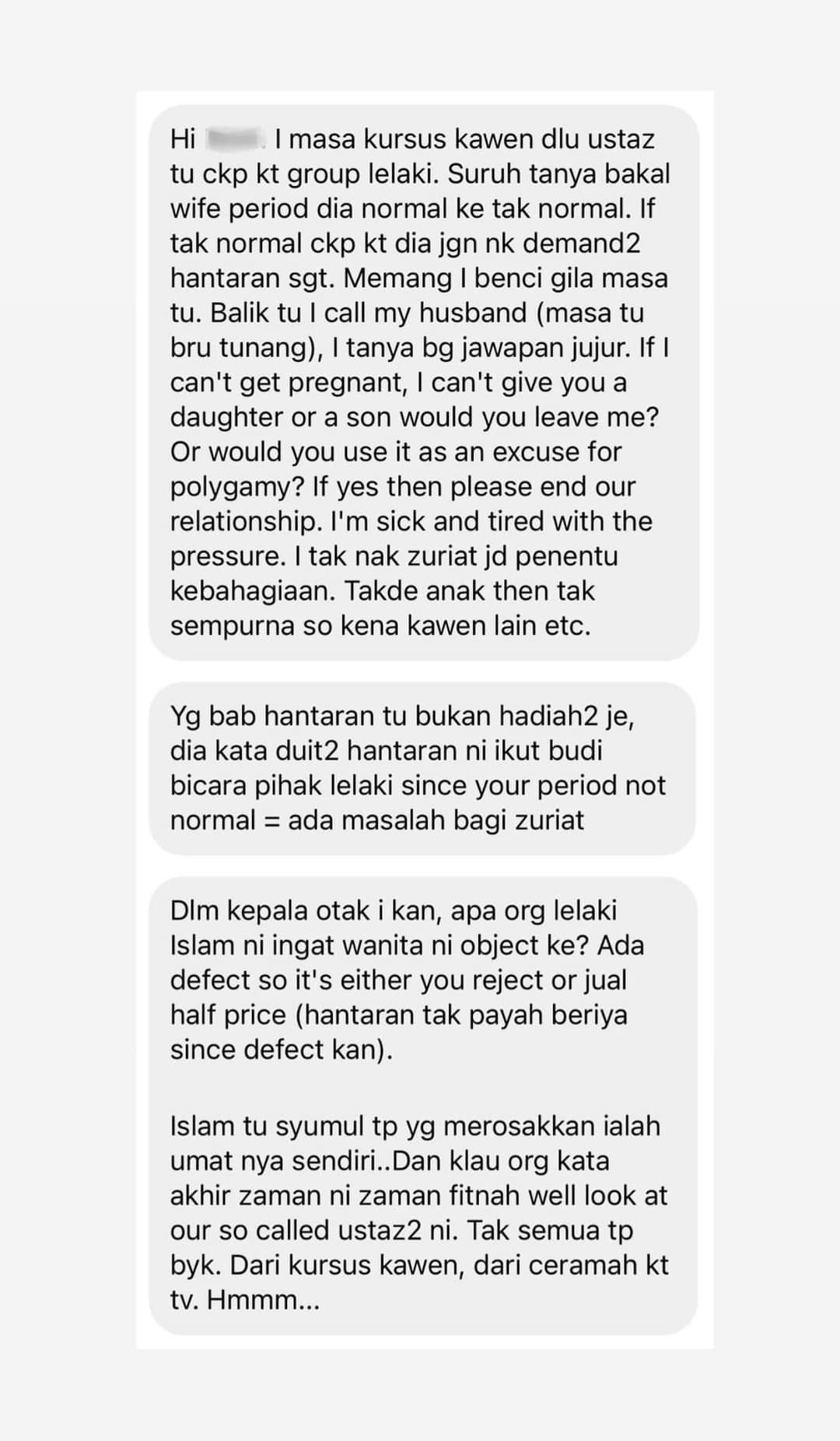 根据特里分享的截图,这名女子在分享本身参加婚前教育课程的经历时指,一名宗教师竟告诉在场的男士们,如果女方月经周期不规律,意味难以怀孕,所以女士们不应要求太多的聘金。