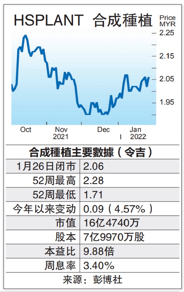 肯纳格研究表示,该公司以8492万5000令吉脱售沙巴斗湖Muul Hill园丘给母公司合成(HAPSENG,3034,主板工业产品服务组)旗下Future Golden发展公司。624公顷农业地皆为租赁地契,皆种以成熟油棕及生产1万5000公吨或2%棕果,因此对合成种植的2022年盈利冲击并不显著,但会带来2340万令吉脱售收益。
