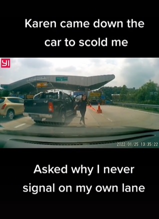 一名华裔女子昨日在社交媒体发布一段视频,可见前方一辆黑色Hilux轿车在收费站前转换车道,虽然有出示讯号灯,却不顾她的车前来,直接转入她行驶中的最右边车道,结果她忍不住立即鸣笛。
