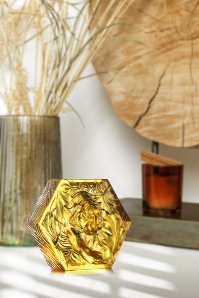 琉璃工房为2022年虎年而设的精品,以“勇者无惧未来”为题,设有多款精致的琉璃作品。琉璃工房工艺师用极为细腻的写实技法雕刻了一只迈步前方的虎王──《光明心仁者行》,通透明净的琉璃虎步履刚健,目光如炬,坚定的望着前方,以琉璃之心向着光明前进。
