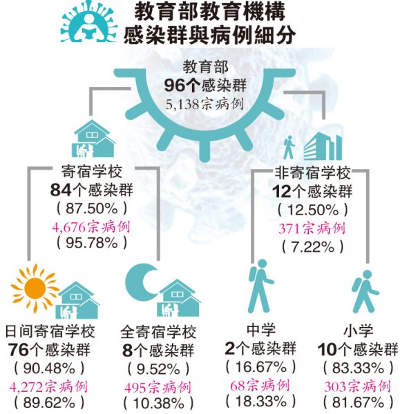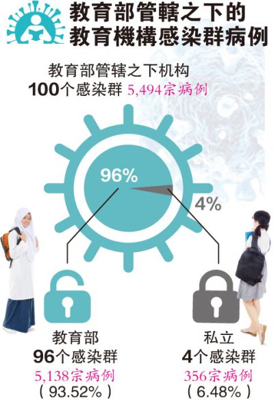 “在96个涉及教育部教育机构的感染群中,有84个涉及寄宿学校,其中76个是日间寄宿学校(共4272宗病例),其余8个涉及全寄宿学校(共495宗病例)。