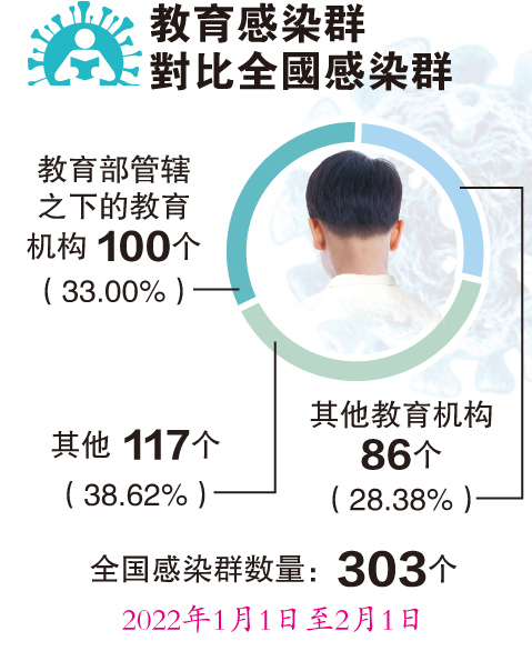 “在12个涉及非寄宿学校的感染群中,则有2个涉及中学(共68宗病例)和10个涉及小学(共303宗病例)。”