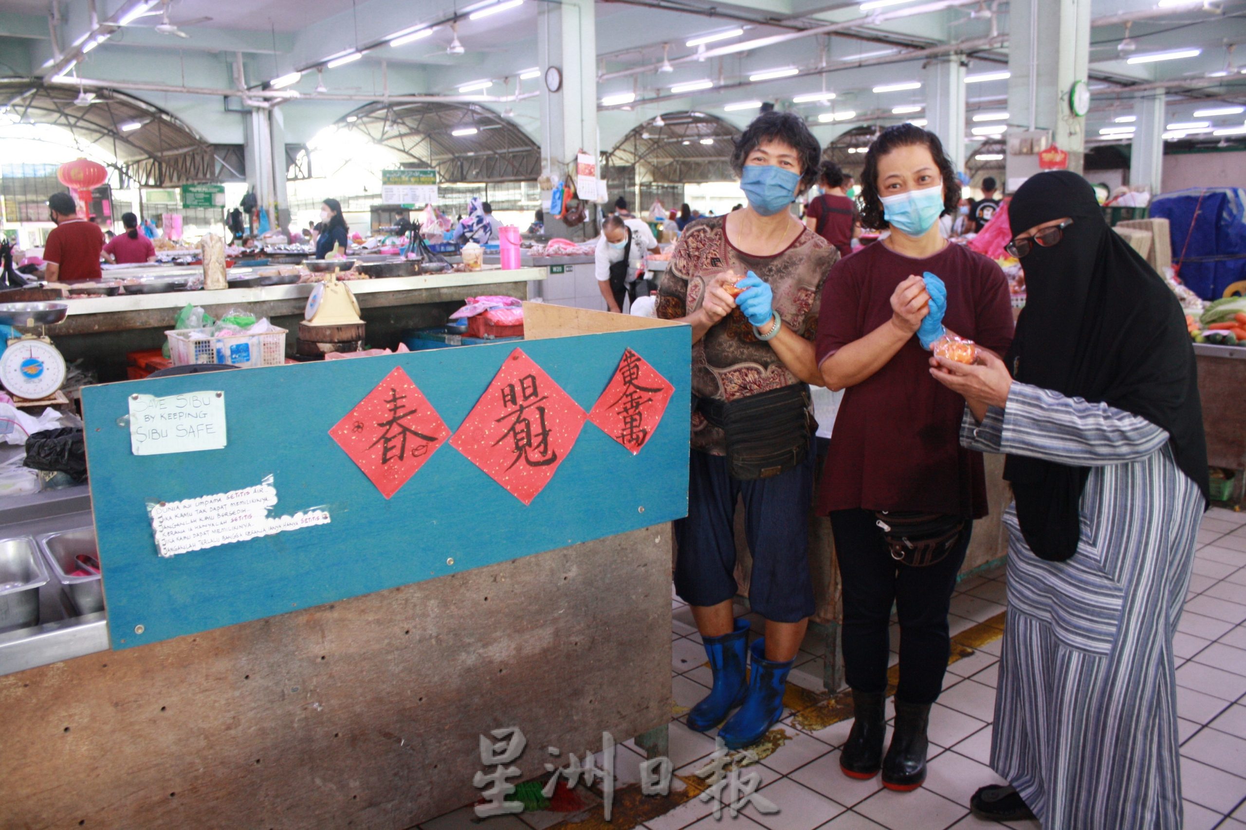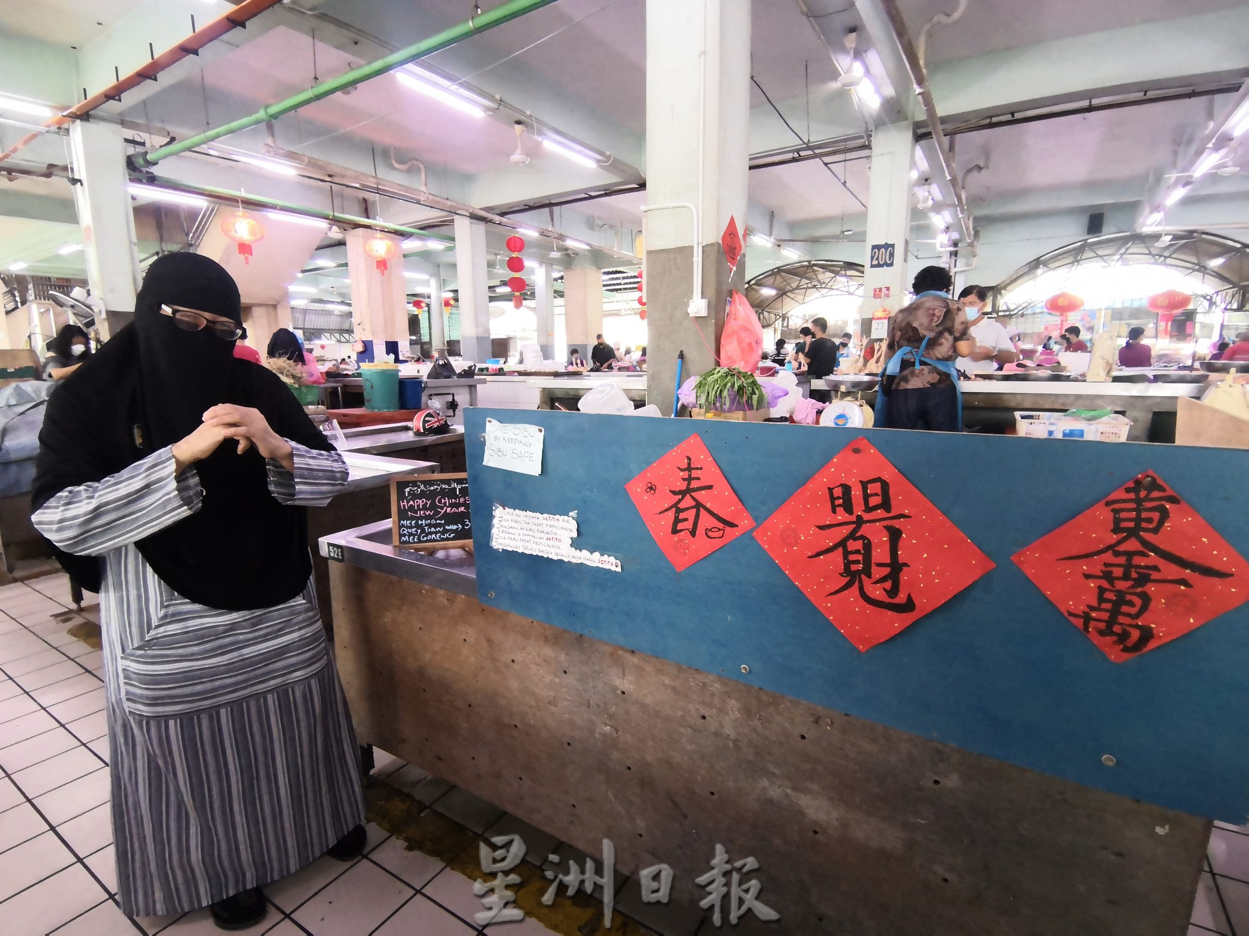 砂拉越诗巫的穆斯林小贩奎娜与华裔同业关系融洽,和谐共处,适逢农历新年,她也在摊位上贴上红春联,恭贺华裔同胞新年快乐!