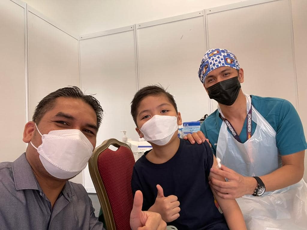 莫哈末拉兹(左)陪伴孩子接种首剂冠病疫苗后比赞合影,记录美好的瞬间。(图取自教长脸书)