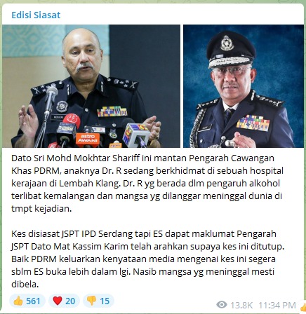 Edisi Siasat的Telegram帐号昨晚指前武吉阿曼政治部总监拿督斯里莫达一名儿子,早前涉嫌酒驾酿车祸,导致另一方死于车祸,但肇祸司机却利用父亲的影响力,通过全国交通调查及执法部总监拿督威拉末卡欣向负责调查车祸的沙登警方施压,让案件结案。