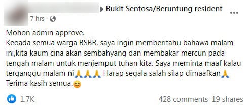 “我想通知居民们,我们华裔将在今晚进行祭拜和放炮以迎接神明。我对今晚为大家造成的困扰感到抱歉,感谢各位包涵。”