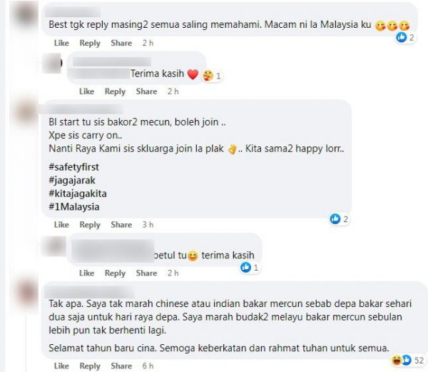 暖心的留言写道,“没问题啦,我们是大马一家嘛,互相尊重各族的风俗与文化,鞭炮声也不是时常有,各个种族也都有放炮啊。”