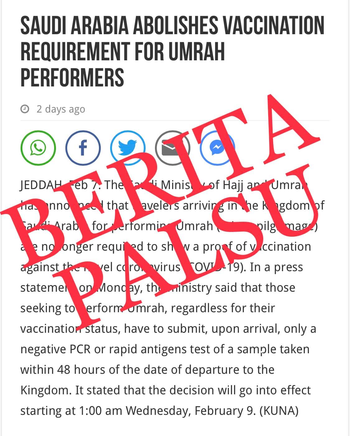“我已经向身处吉达(Jeddah)的朝圣基金局(TH)朝圣领事代表确认,该网站的新闻是不实的,而且国家安全理事会也宣布,从2月14日开始,所有朝圣者都必须接种加强针。”