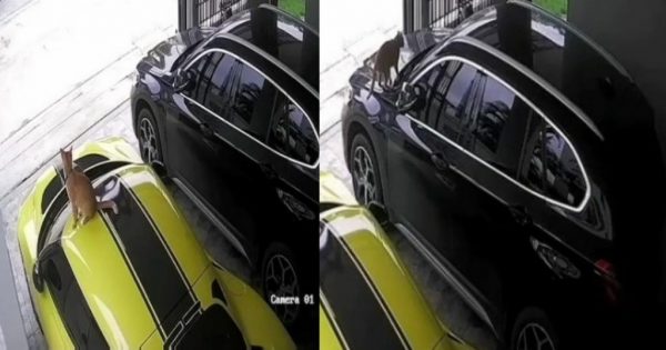 根据车主置于车房前的闭路电视,只见车主家的铁闸门打开,一只猫咪出现跳上并坐在黑色和黄色跑车的顶部。