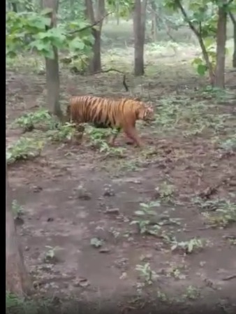 该视频显示一只老虎在树林里游荡,且不断传出咆哮,画面吓人。拍摄者的距离似乎很靠近老虎。