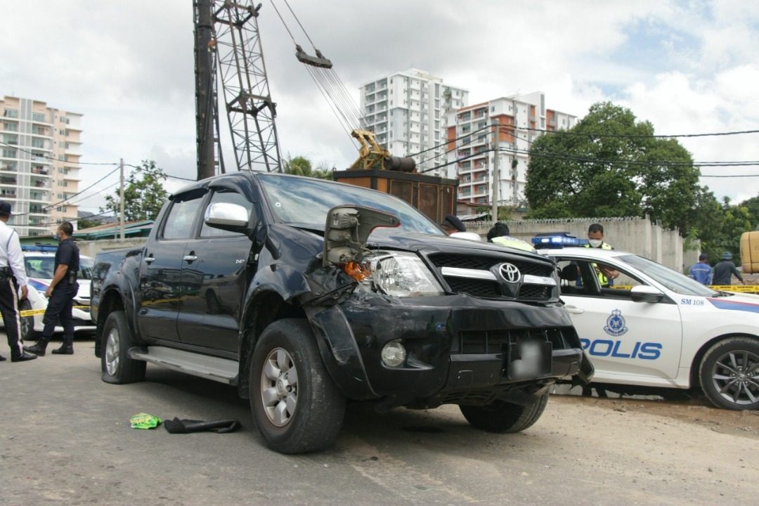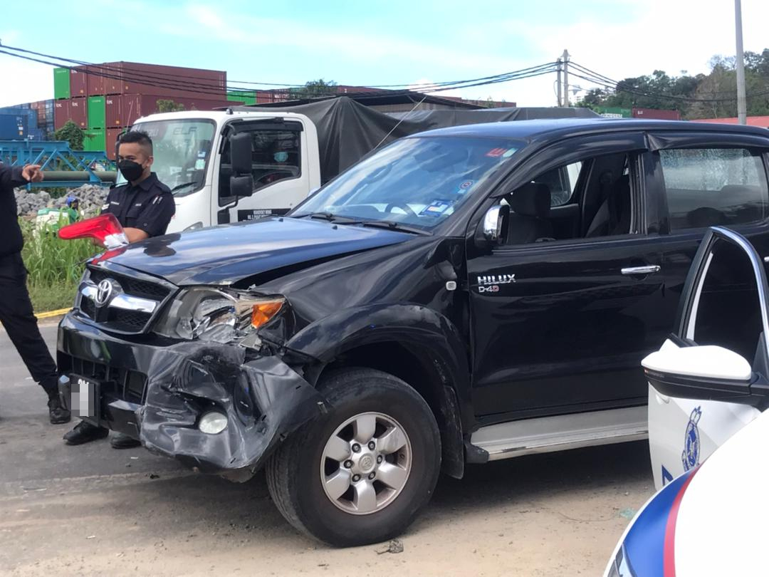 (亚庇14日讯)染金发的彪悍女子驾驶报失货卡逃亡,被警察追捕十多公里过程中撞伤警察和撞开路障,沿途也擦撞数辆车,最后在警察开枪逼停下,才束手就擒。