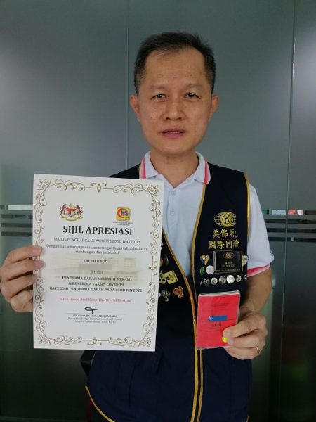 过去我与许多人一样,想要捐血却不敢尝试。首次捐血后,感觉十分良好,隔年卫塞节我再次捐血。后来,我开始留意报章刊登的捐血运动新闻,凡是靠近住家的捐血运动都会参与,至今捐血超过50次。