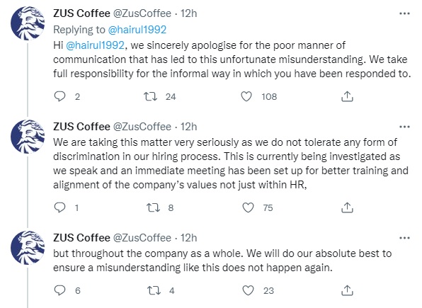 对此,一名自称是Zus咖啡店总经理的男子在推文下留言表示会调查这起案件,并要求海鲁将履历传给他,他会确保所有人都有同等的机会。