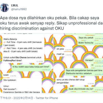 一名男子昨天在网上控诉,他在应征一份咖啡师的工作时,向Zus咖啡馆的人事部坦诚自己是聋哑人士,没想到对方却突然沉默。