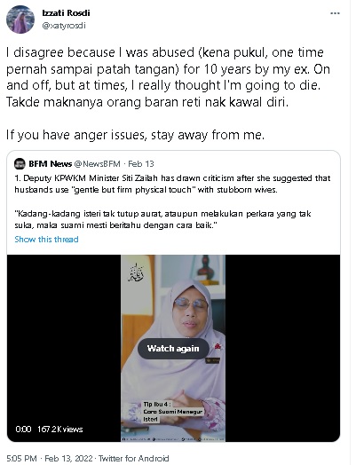 这名妇女日前在推特发文表示,她不认同茜蒂再拉提出丈夫用“温和而严厉的身体接触”来责骂妻子的建议,因为她曾被前夫家暴长达10年,还曾经有一次被暴打致断手。