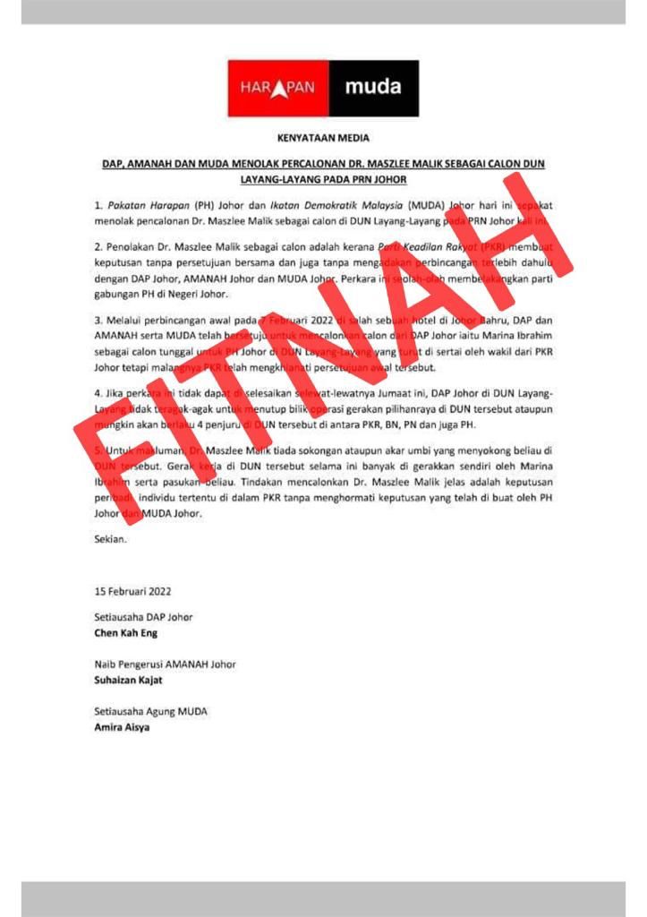这封假文告志期2月15日,信头使用希盟和MUDA徽章,文中指是由行动党柔佛秘书曾笳恩、诚信党柔佛副主席苏海山及MUDA总秘书阿米拉聨署。