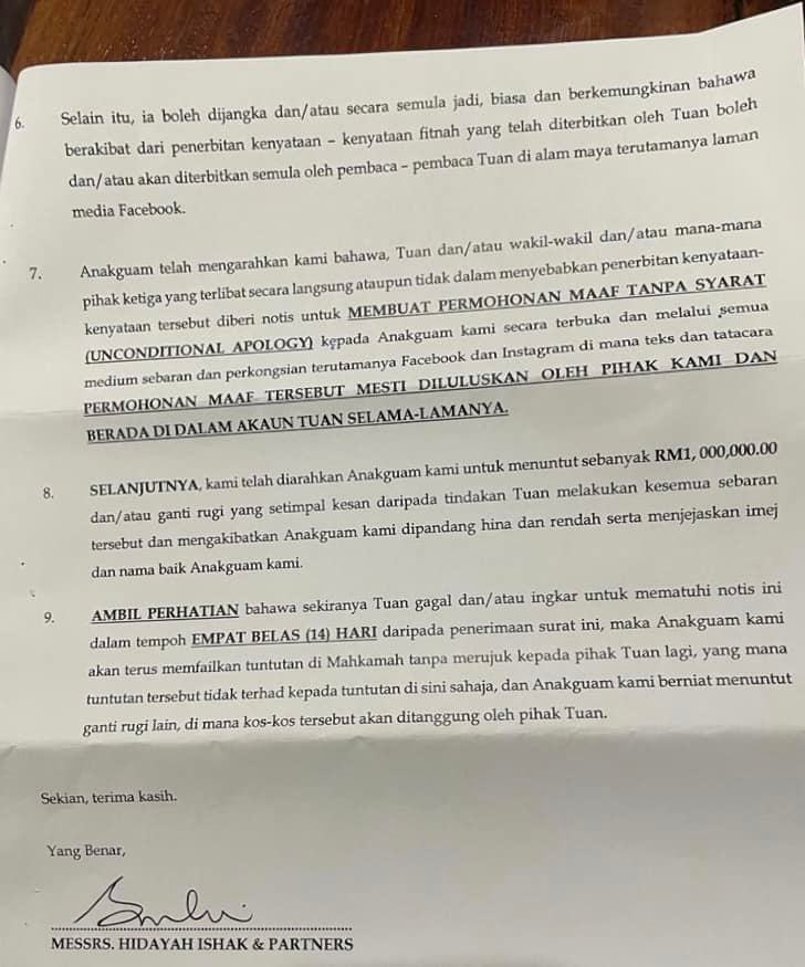 律师信促请黄德在没有任何条件下,向州政府作出公开道歉,道歉内容及用词必须先获得州政府批准,并在社交媒体尤其是脸书及Instagram发布,永远不得撤下。