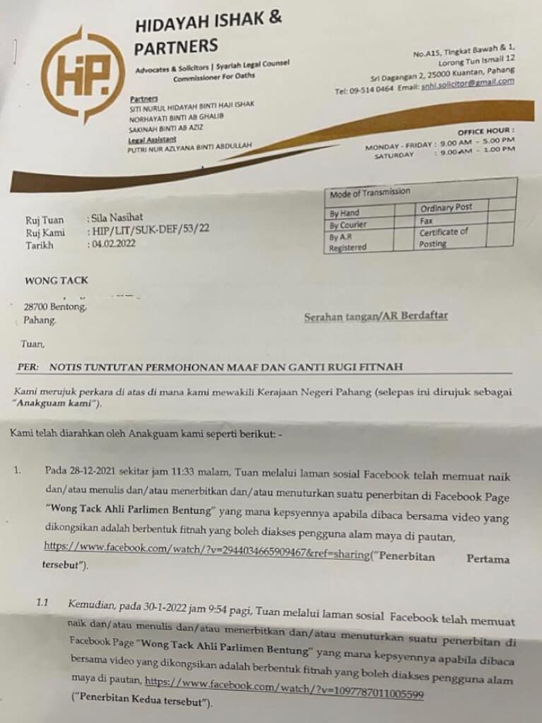 (劳勿16日讯)彭亨州政府以行动党文冬区国会议员黄德在其脸书上载的视频,在没有依据下涉诽谤,诋毁彭州政府的形象为由,向他发出律师信,要求他道歉及赔偿100万令吉名誉损失。