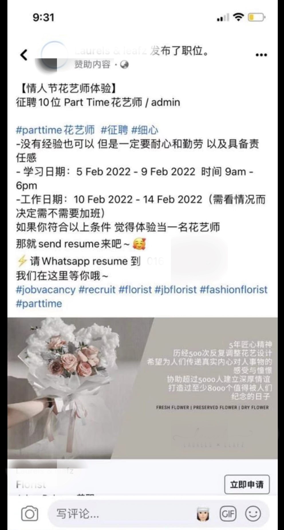 对此,有关花店今早在脸书专页做出回应,并向兼职人员致歉道:“让你们有不好的感受、体验,真的非常抱歉,这个真的不是我们提供花艺师体验的本意。”
