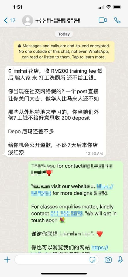 (八打灵再也18日讯)一名学徒在脸书公开自身在情人节期间到花店工作的经历,指店家以5天培训为由不支付薪水,让她感到委屈,帖文被疯传后,部分网民竟传讯息恐吓花店,甚至扬言要“放火烧你的店”、“让店员毁容”!