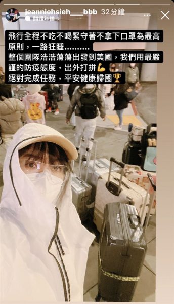 谢金燕穿整套防护衣搭机飞美国。(取自谢金燕IG)