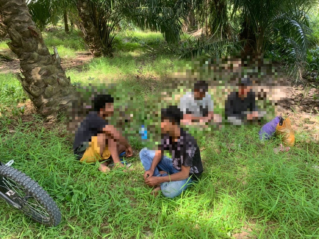 4名外籍男子在油棕园内被拦下盘查,揭发他们是偷渡客。(警方提供)