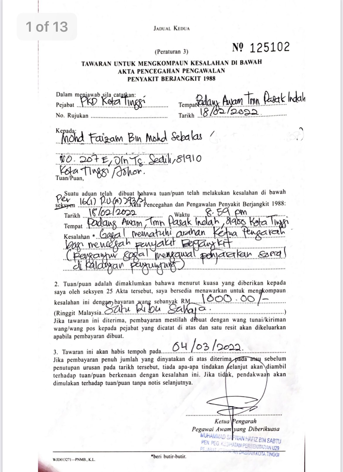 根据另一个名为“Ibdilillah Ishak”的网民在推特上所发的图片显示,卫生局在1988年传染病预防及控制法令下开罚。