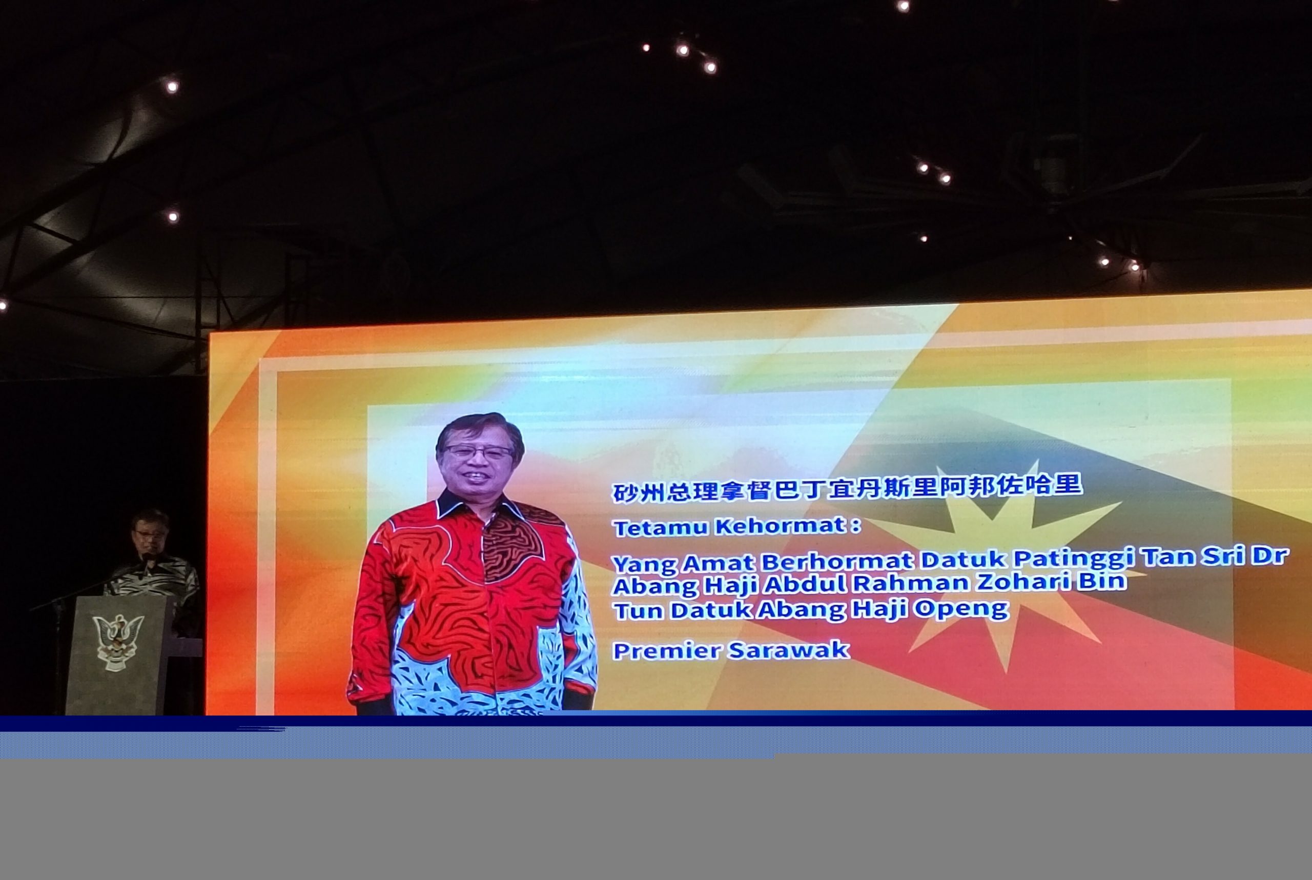 除了大会司仪在会场上称呼阿邦佐哈里外,当他在被邀请上台致开幕词时,荧幕背景的画面字体更是写上华文的“砂州总理”及英语的“Premier Sarawak”字幕。