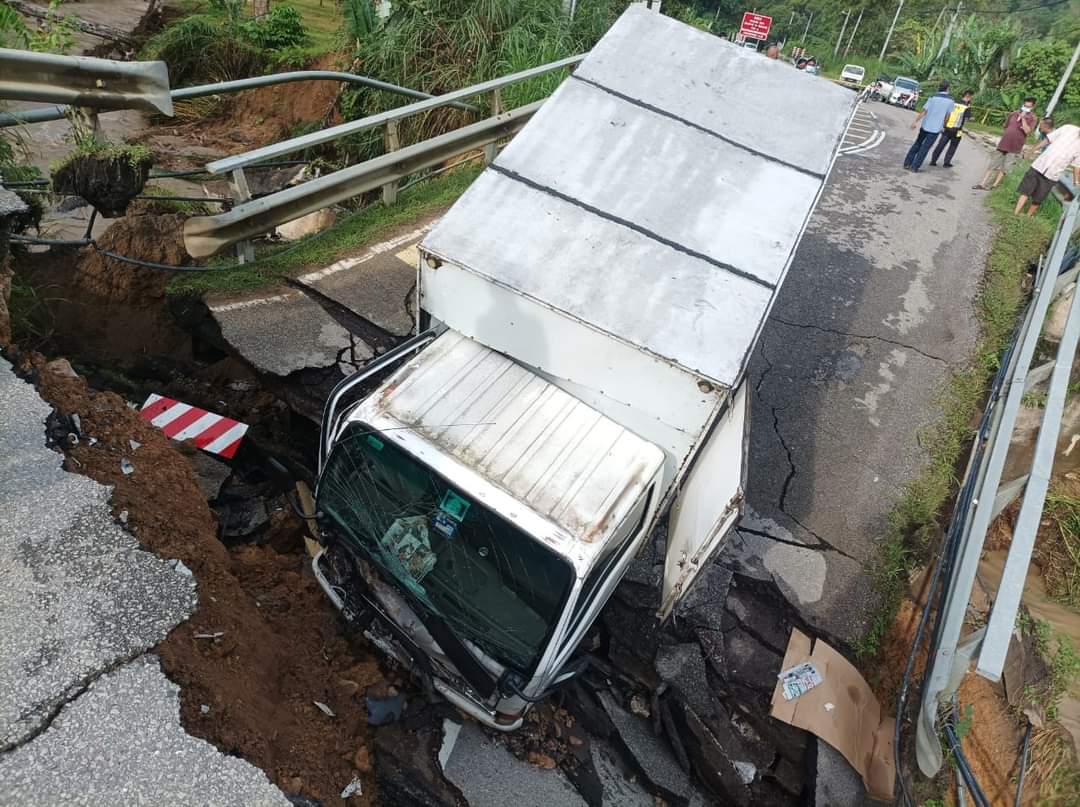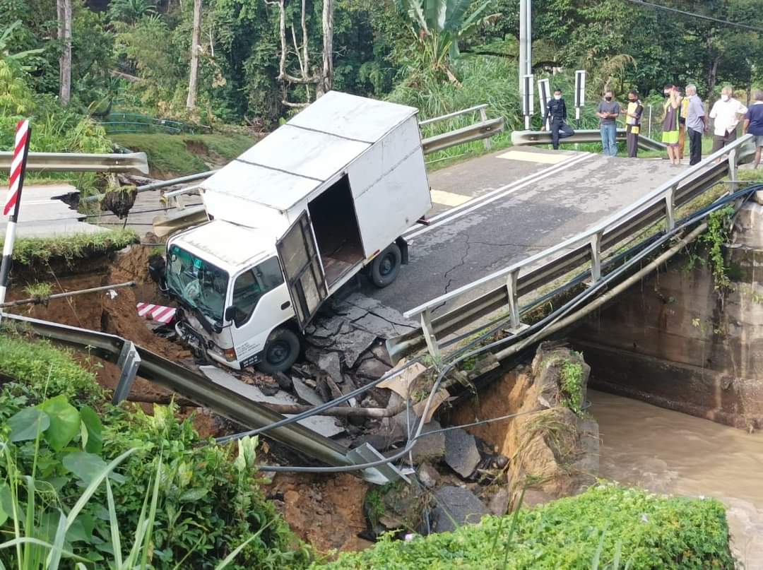 (劳勿22日讯)劳勿通文冬的都赖路一座路桥今日凌晨2时在倾盆大雨中倒塌,不巧一辆载送华文报的报车经过,连人带车撞进塌桥下,所幸司机只受轻伤,目前往返劳勿及文冬的交通中断。