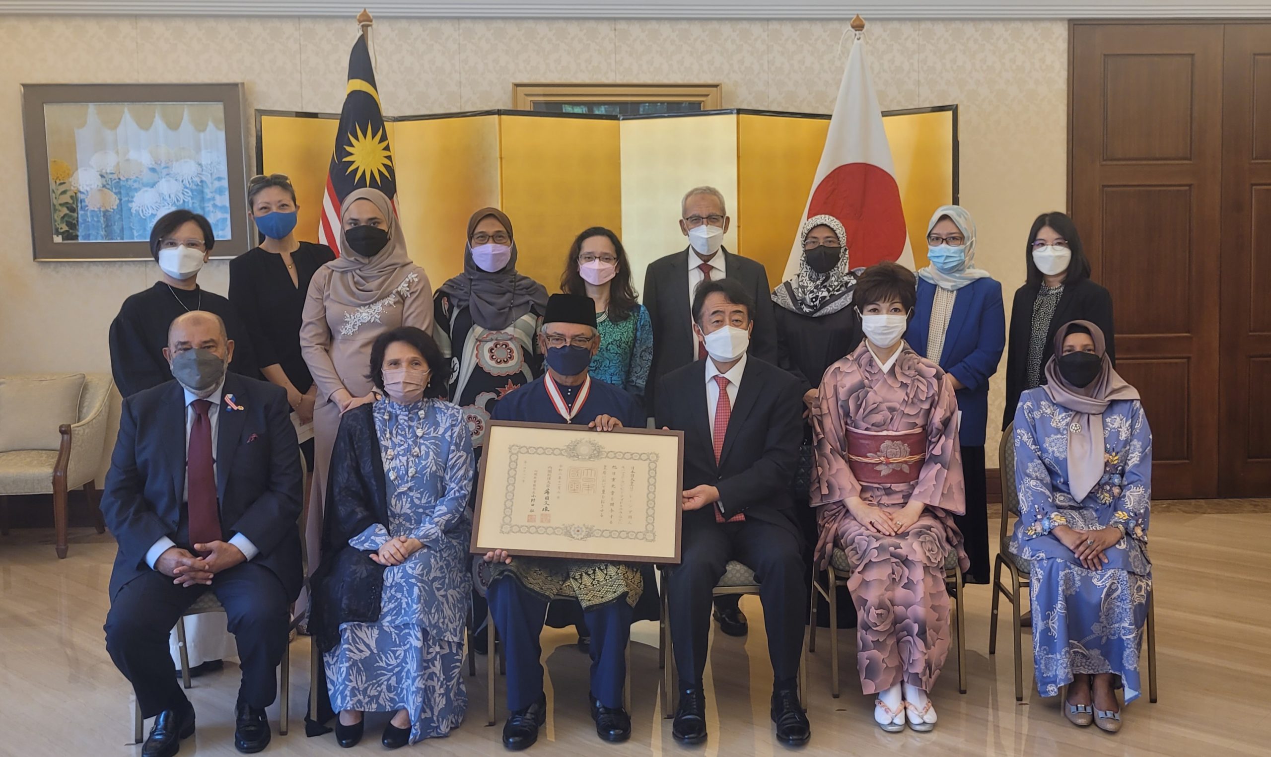 (吉隆坡23日讯)日本驻马大使馆颁发日本旭日金银星勋章(The Order of the Rising Sun, Gold and Silver Star)给前外交部秘书长也是马来西亚前驻日本大使丹斯里莫哈末拉兹,以表扬其促进两国人才交流的贡献。