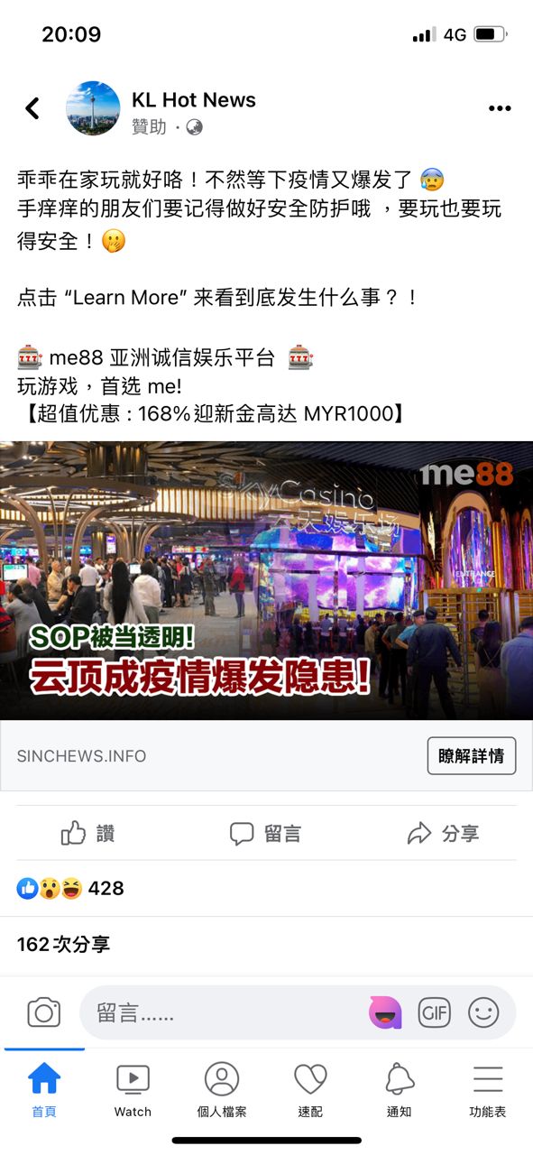 一旦点击链接后,所进入的新闻网页看似与《星洲网》一模一样,然而,有关网页并不是《星洲网》的新闻网页,而是一篇在宣传名为“亚洲诚信娱乐平台”赌博网站的文章。