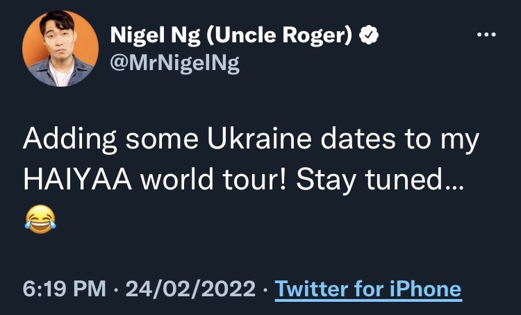 现居英国伦敦的“Uncle Roger”本名黄瑾瑜(Nigel Ng),当全球都非常关注乌克兰局势时,他昨日在推特发文表示,有意将乌克兰加入他世界巡回表演的地点,引来大批网民反感。